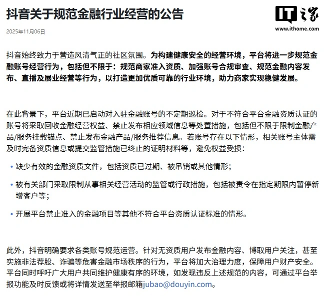 IT之家 11 月 7 日音问,抖音 11 月 6 日发布对于步骤金融行业方向的公告,为构建健康安全的方向环境,平台将进一步步骤金融账号方向看成,包括但不限于:步骤商家准入禀赋、加强账号合规审查、步骤金融本色发布、直播及展业方向等看成。